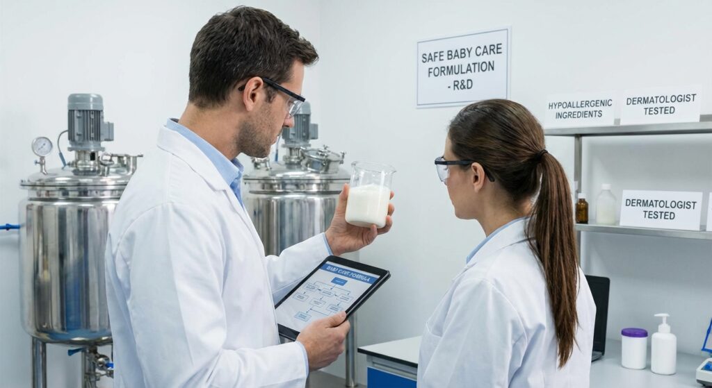 In conclusion, launching a successful baby care line in today’s competitive market demands a partnership with deep scientific expertise and an unwavering commitment to safety. From selecting the right tear-free surfactants to validating hypoallergenic claims with clinical data, every step is a critical building block of brand trust. It involves navigating global regulatory standards and understanding how to nurture the skin’s delicate microbiome. As leading body wash manufacturers, we provide this comprehensive support. Our role as private label body wash manufacturers is to empower you with products that are not only effective but are backed by verifiable proof. Whether you envision a calming shower gel manufacturer or a nourishing lotion, our scientific approach provides the foundation for a brand that parents in Malaysia and beyond will trust for generations. —